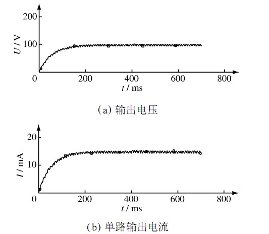 為理論上驗(yàn)證設(shè)計的可行性,采用PSp ice軟件對電路進(jìn)行了仿真分析。結(jié)果如圖2所示。電路在210 ms時進(jìn)入穩(wěn)定狀態(tài),穩(wěn)定后其輸出電壓為97 ±2. 2 V,輸出電流為14. 7 ±0. 3 mA,基本驗(yàn)證了電路設(shè)計的可行性。LED 日光燈電路輸出特性如圖2所示。