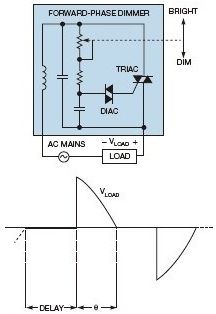 一個標準的正相調光器包含一個TRIAC、一個DIAC(二極管交流)和一個RC(電阻/電容)電路(圖1)。電位計調節(jié)電阻值,得到的RC時間常數(shù)用于控制TRIAC導通前的延遲量,或觸發(fā)角。當TRIAC導通時,時間部分就是導通角θ。得到的電壓波形就是一個切相的正弦曲線。