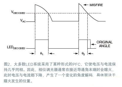 由于大多數(shù)LED系統(tǒng)都采用了某種形式的PFC,輸入電流通常能很好地追隨輸入電壓,這意味著當電壓與電流同時下降時,相位調光器經常會導通角的末端瞎火(圖2)。這種瞎火會根據(jù)其發(fā)生的時點,產生一種不斷變化的導通角解碼。
