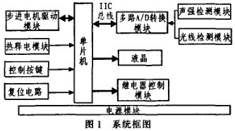 本系統(tǒng)主要以單片機(jī)總控制為核心,由微弱聲音放大檢測(cè)、可見光檢測(cè)、步進(jìn)電機(jī)旋轉(zhuǎn)熱釋電紅外傳感器、A/D轉(zhuǎn)換、液晶顯示等模塊以及控制電路組成。系統(tǒng)框圖如圖1所示。