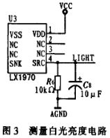 可見光檢測(cè)模塊采用LX1970作為核心芯片。LX1970是美國(guó)微型半導(dǎo)體(Microsemi)公司推出的一種能實(shí)現(xiàn)人眼仿真的集成化可見光亮度傳感器。該模塊采用測(cè)量白光亮度電路(如圖3)。利用src端輸出光-流轉(zhuǎn)換的結(jié)果,然后實(shí)現(xiàn)流壓轉(zhuǎn)換。該芯片性能穩(wěn)定,靈敏度極高。