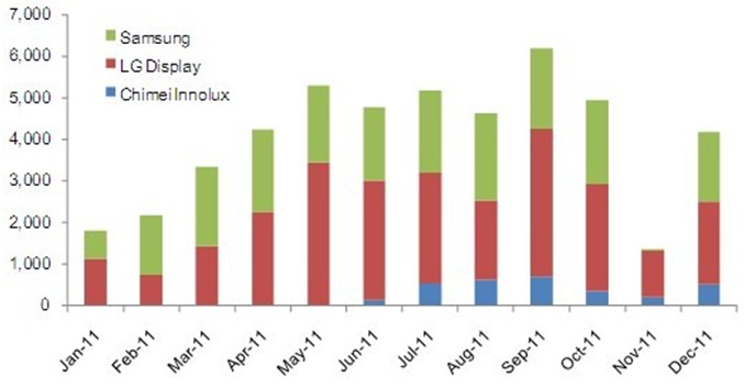 2011年9.7" iPad平板電腦面板出貨達到了4千8百萬片。雖然面板廠商之前的出貨預(yù)期更高,但受到了第四季度庫存調(diào)整的影響而最終無法達到2011年全年5千萬片以上的目標。2011年的9.7寸面板出貨以XGA(1024x768)規(guī)格為主,亮度要求為400nits以上;且采用了IPS或FFS規(guī)格的廣視角技術(shù),而主要的面板供貨商為韓國的三星、LG Display與臺灣的奇美。根據(jù)NPD DisplaySearch每月TFT LCD面板出貨報告(Monthly TFT LCD Shipment Database),三家9.7寸面板供貨商在2011年的出貨各有千秋,如下圖所示。