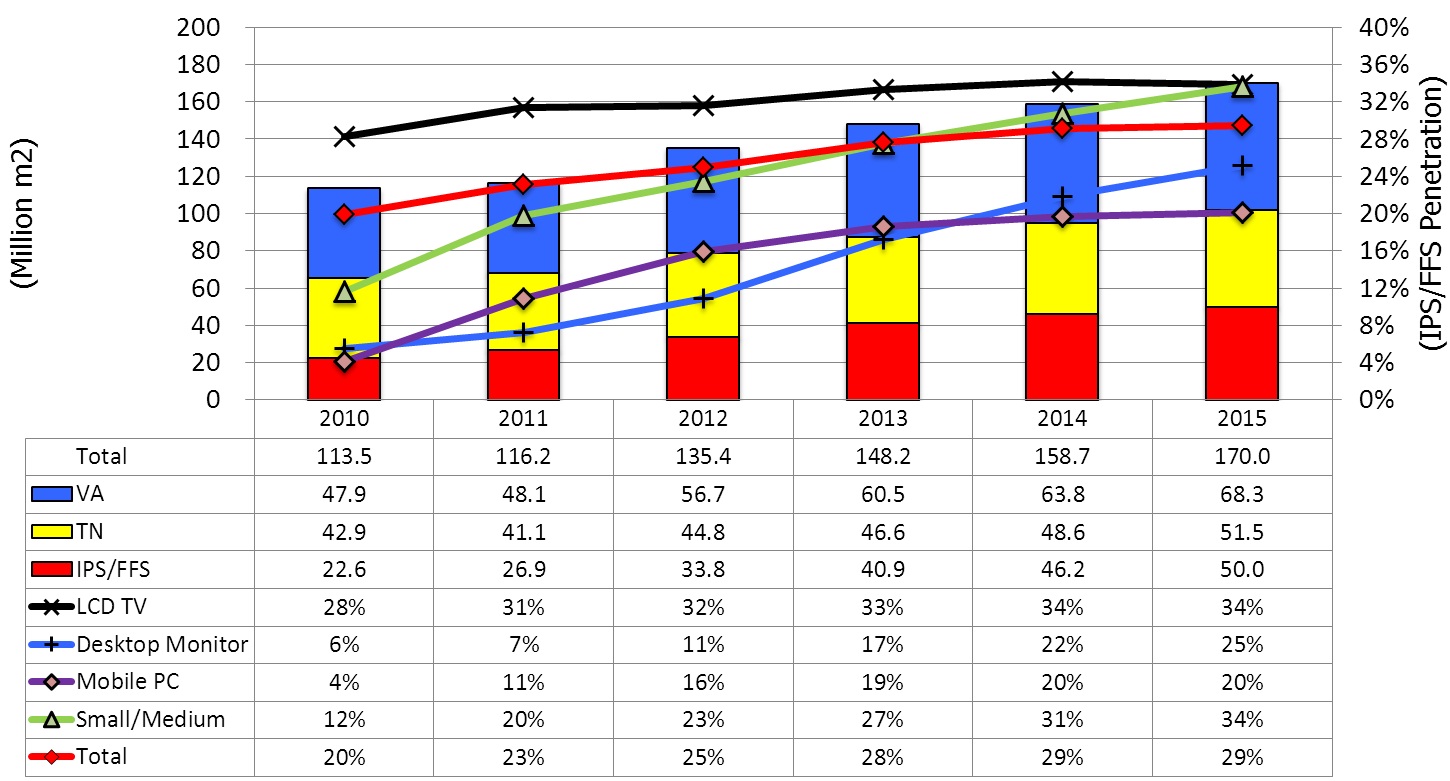 在液晶電視市場(chǎng),廣視角一直是主要的賣(mài)點(diǎn)之一,其中IPS/FFS LCD面板的滲透率在2011年達(dá)到31%。在桌上型顯示器市場(chǎng), IPS/FFS 面板傅統(tǒng)上被用在一些特殊應(yīng)用,例如醫(yī)療設(shè)備,2011年滲透率為7%,而NPD DisplaySearch預(yù)測(cè)這個(gè)數(shù)字在2015年將上升到25%,主因于IPS面板的領(lǐng)導(dǎo)生產(chǎn)商LG Display計(jì)劃使IPS成為桌上型顯示器面板的標(biāo)準(zhǔn)。