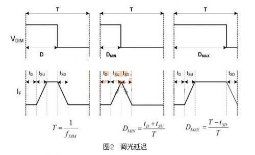 對(duì)于PWM調(diào)光訊號(hào)而言,每個(gè)LED都有限定的響應(yīng)時(shí)間,圖2表示三種不同的延遲,延遲愈大者表示能達(dá)到的對(duì)比度就愈低(對(duì)光強(qiáng)度控制的一種測(cè)量方法)。
