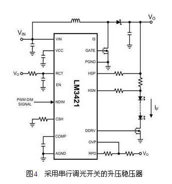 假如真的需要一個(gè)快速的PWM調(diào)光,最佳的解決方案是采用兩級(jí)系統(tǒng),并以降壓穩(wěn)壓器作為第二級(jí)LED驅(qū)動(dòng)級(jí)。不過,若尺寸空間和成本都不容許,退而求其次的最佳選擇便是圖4中的串行開關(guān)。