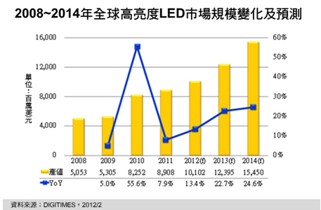 - 2012年全球高亮度LED產(chǎn)值年成長率將為13.4%