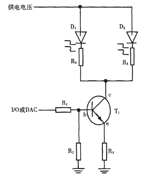 圖中, D1, D2, D3 為發(fā)光二極管, T1 為NPN 型三極管, R1 , R2 , R3 的阻值可根據(jù)總電流I 的設(shè)計(jì)要求進(jìn)行調(diào)節(jié), I/O 或DAC 為控制端口。
