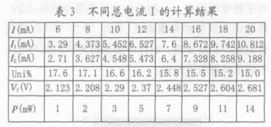 計(jì)算機(jī)利用對(duì)分法算出了在總電流為15mA,外加偏置電阻(R)為R4=R5=0 , 22 , 47 , 68 , 100 , 150, 200 (Ω) 時(shí), D1 和D2 的電流( I1 和I2) 、亮度均勻性( Uni)、正向電壓(V5) 、以及偏置電阻帶來的功耗(P)。