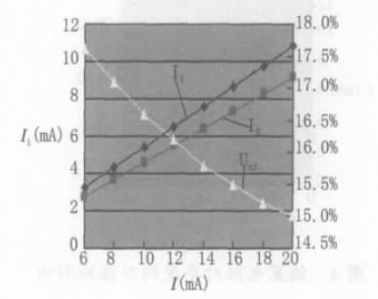 根據(jù)式(2),也可以通過改變LED 的發(fā)光亮度來改善LED 背光源的亮度均勻性,即通過改變系統(tǒng)的總電流來改善亮度的均勻性。本文討論兩個(gè)LED并聯(lián),且外加68Ω偏置電阻的情況,結(jié)果如表3 及圖6 所示。