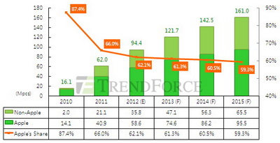 在蘋(píng)果的iPad 3即上市的的之際,2012年平板計(jì)算機(jī)市場(chǎng)的爭(zhēng)奪戰(zhàn)才算正式開(kāi)打,根據(jù)產(chǎn)業(yè)研究機(jī)集邦科技(TrendForce)統(tǒng)合旗下WitsView(面板)、DRAMeXchange(NAND Flash)的研究數(shù)據(jù),預(yù)估在2012年時(shí)全球平板計(jì)算機(jī)銷量將可望達(dá)到9,400萬(wàn)臺(tái),比起2011年的6,200萬(wàn)臺(tái),年成長(zhǎng)達(dá)53.1%,在平板計(jì)算機(jī)的銷售量上,蘋(píng)果仍將維持前二年的強(qiáng)勢(shì)地位,其iPad將占市場(chǎng)六成以上,達(dá)5,900萬(wàn)臺(tái)。
