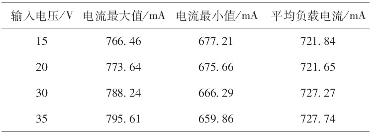表2為不同輸入電壓下負(fù)載電流的峰-峰值。由表中數(shù)據(jù)計(jì)算,在輸入電壓由15V變化至35V的過程中,負(fù)載電流的最大誤差僅為0.81%.
