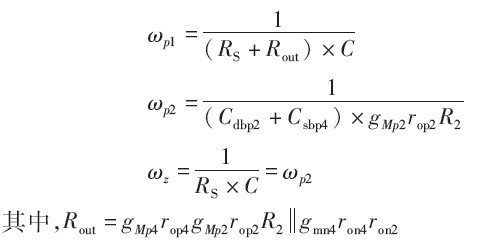 其中,ro4、ro3為 VB''''、VA''''處的等效輸出電阻。設(shè) gm1ro3=gm2ro4=AV,且 Mp5為電流鏡,增益約為1,綜合式(3)到式(5):