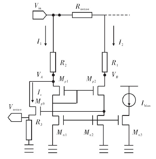 圖2是電路采樣電路結(jié)構(gòu)圖。Rsense為采樣電阻,R1=R2=R;Mp1、Mp2、Mn1、Mn2組成的電壓鏡和Mp9反饋管組成匹配電流源作為電流檢測(cè)電路。其中Mp1與Mp2相互匹配并被偏置在飽和區(qū),Mn1與Mn2是兩個(gè)相同且非常小的電流源,以保證流過Mp1與Mp2的電流相等從而使其具有相等的VSG。