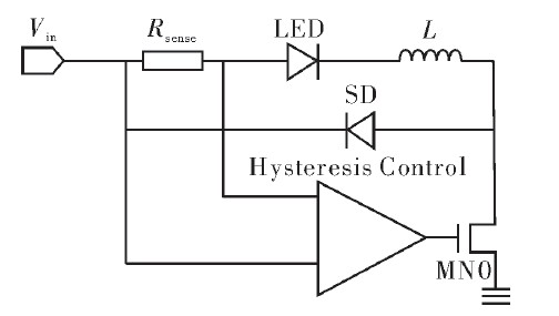 圖1是滯環(huán)控制電路框圖。LED驅(qū)動(dòng)電流的變化反映在Rsense兩端的壓差變化上。滯環(huán)電流控制模塊內(nèi)設(shè)兩個(gè)電流閾值Imax和Imin,當(dāng)電路接上電源時(shí),功率管打開,電源通過Rsense、負(fù)載LED向電感L充電,驅(qū)動(dòng)電流上升。當(dāng)電流>Imax時(shí),控制電路輸出低電平關(guān)閉功率開關(guān)管。此時(shí)電感通過負(fù)載LED、Rsense和肖特基二極管放電,電流下降。當(dāng)驅(qū)動(dòng)電流<Imin時(shí),控制電路輸出高電平打開功率開關(guān)管,重復(fù)上一個(gè)周期的動(dòng)作。通過這種方式控制電路將驅(qū)動(dòng)電流限制在Imax與Imin之間周期性變化,使流過LED的平均驅(qū)動(dòng)電流值恒定。
