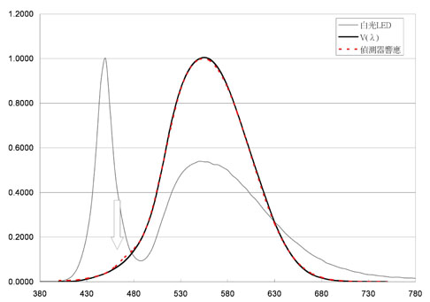 圖5 白光LED多以藍光激發(fā)黃色熒光粉,在藍光波段(圖中箭號表示)處,亮度計探頭的視效函數(shù)(虛線表示)響應(yīng)與CIE V(λ)匹配不佳時,差異的比例就會加大。