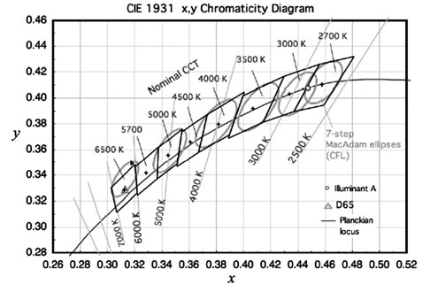 此規(guī)范包含美國國家標(biāo)準(zhǔn)中針對固態(tài)照明產(chǎn)品的光色特性規(guī)格定義,適用于室內(nèi)使用的燈具,不包括戶外燈具。其中,重點有兩部分,其一是定義相對色溫(CCT)的分級,其次是針對同一相對色溫標(biāo)稱等級其允許的色溫變異范圍作定義。