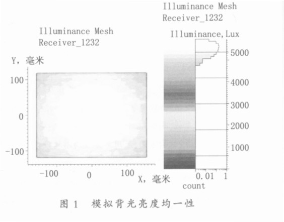 采用STAMPER 技術,一體成型射出導光板,減少印刷環(huán)節(jié),較少印刷污染。以模具射出形成網(wǎng)點,入射面設計能破壞光源的全反射,并控制光源射出導光板面角度的分布,網(wǎng)點數(shù)量的多少對光源做有效的控制。網(wǎng)點可隨模具任意設計形狀,若網(wǎng)點為極小的平滑鏡面,可使光在網(wǎng)點及導光板內(nèi)部的損失減至最小,應用光學設計軟件進行網(wǎng)點設計。圖1 所示為模擬的背光組件的亮度均一性。