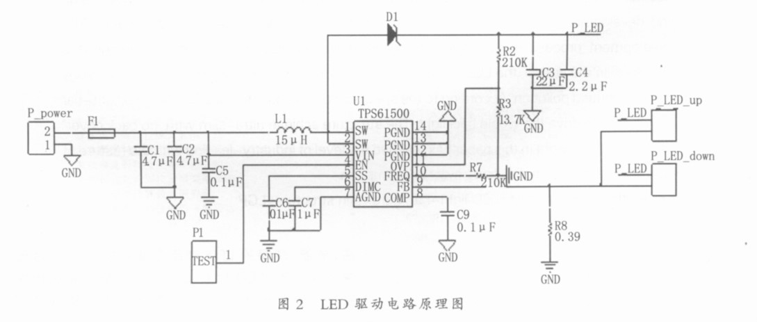 在側(cè)光式背光組件中, 應用長條式的LEDlight- bar 作為整個組件的光源,LED light- bar 采用白光頂發(fā)光LED.以某機種產(chǎn)品為例,單顆功耗:3.2V×0.02A=0.064W.整個light- bar 功耗:0.064W×42=2.69W.LED 背光源電路設計主要包括發(fā)光條設計和驅(qū)動控制電路設計,驅(qū)動電路采用一款DC/DC 恒流驅(qū)動芯片,對發(fā)光條進行恒流驅(qū)動。圖2 所示為LED light- bar 的驅(qū)動原理圖。