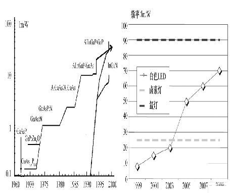 圖2 LED 發(fā)光效率發(fā)展趨勢( 左) 及與傳統(tǒng)光源效率比較( 右)