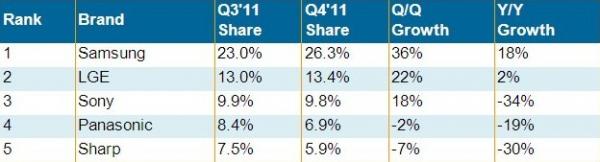 2011年第四季度,三星全球平板電視營(yíng)收占比提高到26.3%,為所有品牌歷史最高,且較第三季度提高了三個(gè)百分比。此外,在液晶電視和等離子電視方面,三星營(yíng)收占比仍然遙遙領(lǐng)先,且等離子電視占比首次超過(guò)松下而居于首位;三星也是3D電視和LED電視市場(chǎng)的領(lǐng)先品牌。樂(lè)金電子為全球第二大品牌,占比為13.4%,且是除了三星以外唯一一個(gè)前五大品牌中在第四季度取得營(yíng)收成長(zhǎng)的品牌。索尼排名第三,營(yíng)收占比為10%,但較去年同期下降了30%以上。