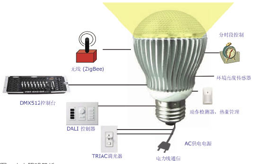 未來照明革新市場潛力巨大,如圖1所示。分時段控制是指在不同時間段有不同的亮度。環(huán)境亮度傳感器可以靈活應(yīng)對燈具所處環(huán)境的亮度,比如天陰的時候天黑的比平常早,那么路燈就會提前打開。動作傳感檢測器是指夜晚的時候如果燈具周圍無人活動時,會調(diào)低亮度,當檢測到有人活動時,就會調(diào)高亮度。另外,現(xiàn)代照明需要有多重通信方式,除了無線方式以外,DALI或DMX512等先進的照明專用通信協(xié)議使得燈具的管理更加便捷,電力線載波通信(PLC)也是近年來備受關(guān)注的方向。