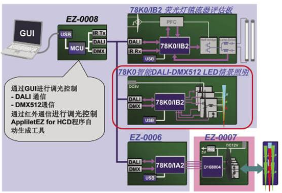 瑞薩電子的照明參考方案由3部分組成,可通過PC端GUI進行調(diào)光控制,PC和通信板通過USB線連接,情景照明板和通信板之間可以由紅外、DALI及DMX512三種方式實現(xiàn),在瑞薩電子的照明參考方案中,可以使用AppliletEZ for HCD程序自動生成工具,實現(xiàn)照明控制程序的涉及、編譯和燒寫。照明參考方案如圖5所示。