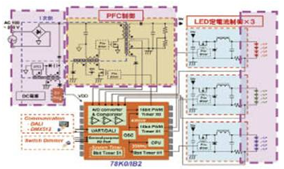 基于78K0/IB2 LED路燈方案如圖8所示??蓪崿F(xiàn)AC220V,具有 PFC;驅(qū)動總功率60W;調(diào)光通信接口可采用RS485/PLC接口。