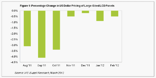 據(jù)IHS iSuppli公司的液晶(LCD)價(jià)格追蹤報(bào)告,盡管需求低迷,但2月份用于電視、監(jiān)視器和筆記本電腦的大尺寸液晶面板價(jià)格保持穩(wěn)定,下降0.5個(gè)百分點(diǎn)。
