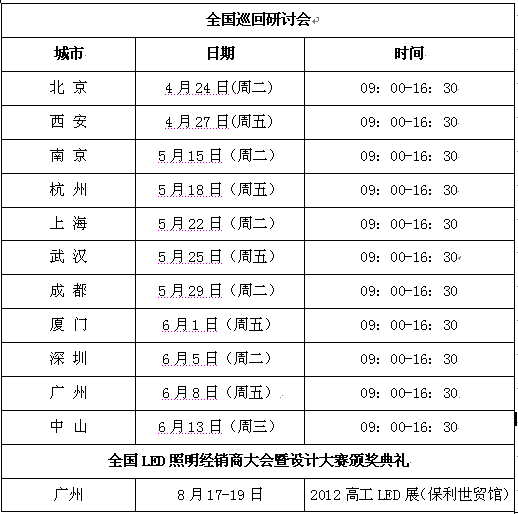 整個巡回研討會暨大賽將持續(xù)5個月時間,3月份為活動啟動宣傳階段,4-5月份為全國巡回研討及大賽報(bào)名階段,6‐8 月份為大賽作品提交及評審階段。巡回總結(jié)大會暨設(shè)計(jì)大賽頒獎典禮將于2012 高工LED 展期間(8 月17 日)在廣州保利世貿(mào)館召開。