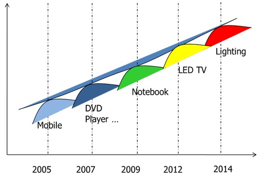 綜觀LED的發(fā)展過程,2002年起LED從小尺寸顯示器(主要應(yīng)用在手機上)開始滲透,在2005年達(dá)到高峰。但是隨著效率的提升,單位顯示器使用的LED顆數(shù)也逐漸減少。當(dāng)手機成長趨于飽和狀態(tài)下,LED總需求量便開始下滑。在此時LED便開始尋找下一個應(yīng)用:中尺寸顯示器。隨著性價比的不斷提升,LED于2007年在中尺寸顯示器的需求達(dá)到飽和,與先前小尺寸一樣LED需求開始往下。LED開始進(jìn)入到另一個應(yīng)用:筆記本電腦顯示器,并于2009年底開始進(jìn)入電視顯示器的應(yīng)用。隨著LED在大尺寸顯示器的廣泛應(yīng)用,LED的性能已經(jīng)提升到每瓦100流明以上,而價格也快速下降,此趨勢對于LED在照明應(yīng)用的發(fā)展有著無比的助力。