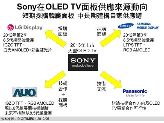 2012年下半至2013年南韓兩大面板廠商因具備大尺寸OLED TV面板量產(chǎn)能力,且Sony具備龐大LCD TV面板采購(gòu)力(2011年占全球10%)可作談判籌碼,因此黃銘章預(yù)期,南韓面板廠尤其是Samsung面板事業(yè),將會(huì)供應(yīng)給Sony所需面板;但中長(zhǎng)期而言,南韓三星與LG與Sony在電視市場(chǎng)針?shù)h相對(duì),因此Sony仍會(huì)希望建構(gòu)自家供應(yīng)鏈,此時(shí),具備OLED技術(shù)及大尺寸TFT產(chǎn)能可供轉(zhuǎn)換為OLED生產(chǎn)線的友達(dá),將較有機(jī)會(huì)打入Sony OLED TV的供應(yīng)鏈中。