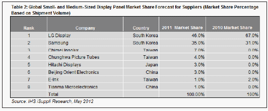 據(jù)IHS iSuppli公司的中小顯示器市場追蹤報告,LG顯示器和三星顯示器去年是火爆的平板產(chǎn)品市場的最大顯示器面板供應商,合計占有超過80%的出貨量份額。