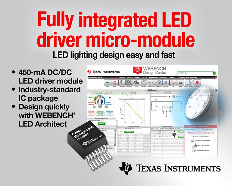 日前,德州儀器 (TI) 宣布推出兩款全面集成型 LED 驅(qū)動器微型模塊,其可消除 LED 驅(qū)動器設(shè)計中常見的外部組件及復(fù)雜布局安放問題。該 450 mA TPS92550 及 TPS92551 DC/DC LED 驅(qū)動器模塊是業(yè)界率先采用統(tǒng)一 IC 封裝集成所有所需電源及無源電路系統(tǒng)的產(chǎn)品,可為 LED 實現(xiàn)高達 23 W 的功率。如欲了解更多詳情,訂購樣片與評估板,敬請訪問:http://www.ti.com.cn/product/cn/tps92550。觀看視頻,請點擊:http://www.ti.com/tps92550-prv。