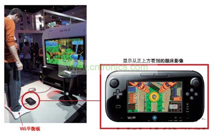 除了改變用戶立場來玩的游戲之外,任天堂還以使用雙屏幕實現(xiàn)更具臨場感的游戲體驗為目標。“Wii Fit U”中的蹦床游戲“Trampoline Target”就是一個很好的例子(圖4)??蓪Ⅲw重計式控制器“Wii平衡板”當(dāng)做蹦床來操作。在平衡板旁邊的地板上放置的GamePad的畫面上,會顯示從正上方俯視蹦床的影像,蹦得越高蹦床就會變得越小,越接近蹦床就變得越大。這種顯示方法可使用戶感覺像自己真的在蹦床上彈跳一樣。