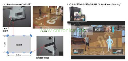 (a)是Renaissance經(jīng)營的健身俱樂部設置的“e運動場”。使用投影儀把游戲畫面投影投影到訓練館中,用戶親身參與其中。人體動作使用距離圖像傳感器獲取。照片上是2位運動員相對而立,向對方球門射出虛擬球的“空氣曲棍球”游戲。(b)是耐克公司與微軟公司合作為“Xbox 330”開發(fā),支持Kinect的健身軟件“Nike+Kinect Training”的畫面示例。該軟件將檢測身體的動作,為目標提供有效訓練方式。