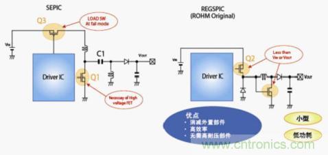 面對(duì)車載特有的電池電壓波動(dòng)和多樣化的LED燈數(shù),以升壓方式和降壓方式很難進(jìn)行LED的閃爍控制與平臺(tái)設(shè)計(jì),要滿足市場所要求的高可靠性與縮短開發(fā)周期之間的平衡實(shí)屬不易。因此,為了不依賴電池電壓、可以始終穩(wěn)定供給DC/DC轉(zhuǎn)換器輸出電壓,ROHM采用了一種稱為“REGSPIC結(jié)構(gòu)”的獨(dú)有升降壓方式。下面介紹REGSPIC結(jié)構(gòu)與一般的升降壓方式所用的SEPIC結(jié)構(gòu)相比所具有兩個(gè)優(yōu)點(diǎn)。