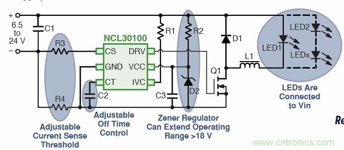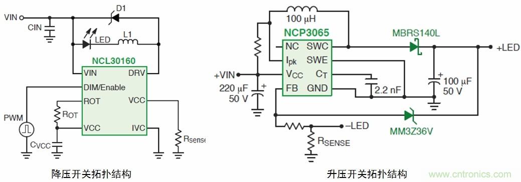 用于中等電壓通用照明的開關(guān)驅(qū)動器有多種拓?fù)洌缃祲?、升壓;降?升壓的NCP3065和NCP3066(可以配置為控制器)、NCP3163、MC33163、NCP1294;降壓的CAT4201、NCP1034、NCL30100、NCL30105、NCL30160、NCL30161;此外還有升壓或SEPIC的CS5171/3。