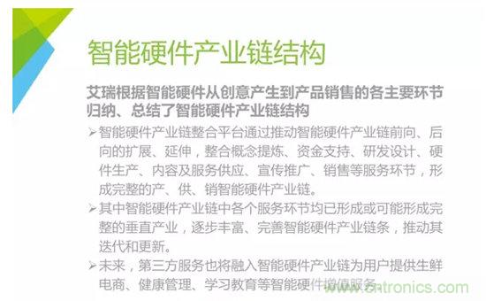 作為此次系列報告的開篇,京東智能與艾瑞對當前智能硬件的產(chǎn)業(yè)鏈結(jié)構(gòu),發(fā)布了行業(yè)報告《2015中國智能硬件產(chǎn)業(yè)系列研究報告——產(chǎn)業(yè)鏈圖譜篇》該圖譜對現(xiàn)階段的智能硬件的發(fā)展趨勢進行了劃分和定義,并對產(chǎn)業(yè)鏈的結(jié)構(gòu)進行了分析。