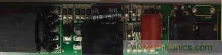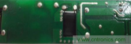 7、在輸入AC265V時(shí)實(shí)際測(cè)量開關(guān)管DS極之間最高峰值電壓有524V,而開關(guān)管DS極之間的距離僅有0.67mm,安全距離明顯不夠,因此很容易造成炸機(jī)現(xiàn)象,特別是在助焊劑不純的情況下,DS極之間會(huì)形成一個(gè)電阻,那就更加容易出現(xiàn)炸機(jī)現(xiàn)象。改善對(duì)策是重新修改PCB將開關(guān)管的引腳改為品字形設(shè)計(jì),加大安全距離。