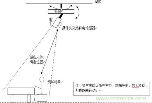 模型設計為,在一個房間的天花板處安裝此系統(tǒng),當一個人進入房間時,系統(tǒng)可以自動識別有人進入房間,led射燈打開并照亮人所在位置(及其周邊一定區(qū)域);當人在房間里移動時,位于系統(tǒng)云臺上射燈發(fā)射的燈光會跟隨人體運動。