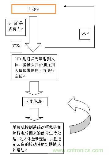 系統(tǒng)初始化之后,對狀態(tài)進行判斷,若沒檢測到人,則一直處于檢測狀態(tài);若檢測到有人,則單片機控制IO口打開開關使得LED射燈發(fā)光照射到人體,攝像頭開始捕捉人體位置信息,并進行定位;當人體移動時,單片機控制系統(tǒng)對熱釋電和攝像頭傳回來的信號進行處理,對人體重新進行定位,并且控制云臺轉(zhuǎn)動使射燈跟隨人體運動;當人體再移動,便繼續(xù)“人體移動----數(shù)據(jù)處理---轉(zhuǎn)動云臺”這個循環(huán)過程。