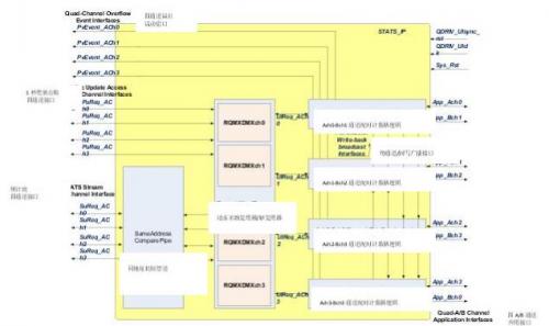 SACOMP模塊圖包含兩個管道階段,其中一個用于通過比較將同一時鐘周期上的所有四條通道進行壓縮(SACOMP_ChN-to-All),另一個用于對單一通道上的同一地址進行雙向(突發(fā)2)比較(SACOMP_B2BChN)。當兩條或更多條通道在指定的時間實例中為同一地址時,優(yōu)先性最高的通道積累地址相同的通道上出現(xiàn)的數(shù)據(jù),而所有其他優(yōu)先性較低、地址相同的通道都將失效。這確保了單一統(tǒng)計請求覆蓋所有地址相同的通道,從而預防出現(xiàn)任何數(shù)據(jù)一致性問題。比較和積累算法對所有可能的情況進行快速評估。此外,在單根通道上,如果有同一存儲位置的雙向統(tǒng)計更新請求,則最新請求失效,其數(shù)據(jù)通過之前發(fā)生的請求積累。這樣能夠確保任何同一地址位置的雙向存取不會在QDR-IV存儲設備定義的讀取延遲中發(fā)生。圖2所示的請求-復用– 解復用(RQMXDMXChn)區(qū)塊接收對應通道數(shù)的處理器更新請求和統(tǒng)計更新請求。由于處理器更新請求的間隔時間固定,因此RQMXDMXchN選擇對應下一個時鐘服務的處理器請求,并且通過“請求就緒”回壓信號停止統(tǒng)計請求。在開始處理每個一秒更新請求后,RQMXDMXchN停止配置時鐘數(shù)(默認為10)的處理器請求通道以確保不會提供連續(xù)的一秒更新請求服務。停止信號發(fā)送至NPU,確保在回壓信號失效前不會產(chǎn)生新的請求。該機制能夠在不堵塞這一設計的情況下處理統(tǒng)計和處理器請求。