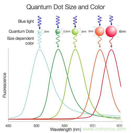 不同大小尺寸的量子點(diǎn)會發(fā)出不同的顏色,量子點(diǎn)當(dāng)受到光或電的刺激時,就發(fā)出有色光線,光線的顏色由量子點(diǎn)的組成材料和大小形狀決定,一般顆粒越小,會吸收長波,顆粒越大,會吸收短波。