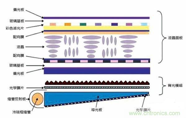 我們先來看看歷史已久的LCD顯示技術(shù),LCD顯示屏結(jié)構(gòu)非常復(fù)雜,LCD 的構(gòu)造是在兩片平行的玻璃基板當(dāng)中放置液晶盒,下基板玻璃上設(shè)置TFT(薄膜晶體管),上基板玻璃上設(shè)置彩色濾光片,通過TFT上的信號與電壓改變來控制液晶分子的轉(zhuǎn)動方向,從而達(dá)到控制每個像素點(diǎn)偏振光出射與否而達(dá)到顯示目的。
