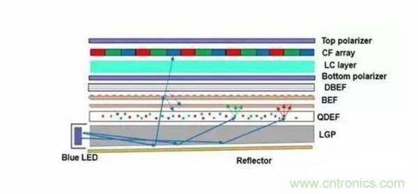 與此同時,QDEF層連擺放位置很計(jì)較,為了讓光在層層光學(xué)膜中旅行時,重復(fù)反射通過QDEF的次數(shù)增多,所以QDEF還得放在離光源最近的地方,一但順序往上移,紅綠光的轉(zhuǎn)換不足,就會造成偏藍(lán)的現(xiàn)象。
