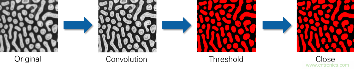 現(xiàn)在考慮一個(gè)真實(shí)的例子,比如粒子計(jì)數(shù)所需的圖像。首先需要應(yīng)用卷積濾鏡來(lái)銳化圖像。接下來(lái),通過(guò)閾值運(yùn)行圖像以生成二進(jìn)制圖像。這不僅可以通過(guò)將其從8位單色轉(zhuǎn)換為二進(jìn)制來(lái)減少圖像中的數(shù)據(jù)量,還可以為二進(jìn)制形態(tài)學(xué)應(yīng)用準(zhǔn)備圖像。最后一步是使用形態(tài)學(xué)來(lái)應(yīng)用關(guān)閉功能。這會(huì)去除二進(jìn)制粒子中的任何孔。