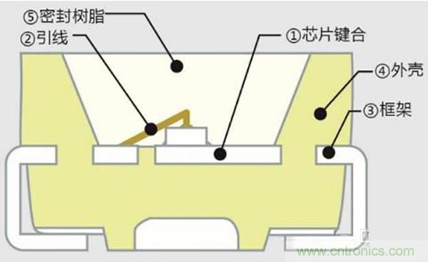 一直以來,存在元件晶片鍵合*2)所用的焊膏部位變黑導(dǎo)致LED發(fā)光強(qiáng)度降低的問題。但是,新開發(fā)LED的結(jié)構(gòu)與部件,羅姆采用從元件到封裝的垂直統(tǒng)合型生產(chǎn)體制,芯片鍵合、引線、框架每個(gè)部位均可采取抗硫化措施。