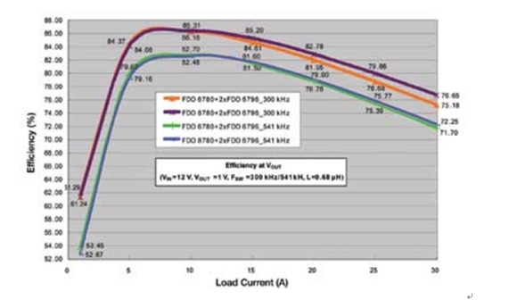 注意上面的兩條曲線,在滿載(30A)時,可以看到最新的器件的效率有1.5%的改進。同樣還是這兩條曲線,在負荷較?。?5A)時,可以實現(xiàn)0.69%的改善。如果對整個負荷范圍積分,那么與今天常見的方案相比,使用最新的MOSFET器件時平均功率損耗可以降低8%~10%。即使在較高的開關(guān)頻率541kHz處,可以看到在負荷小時系統(tǒng)級效率仍然高于80%,而在滿載時效率大于70%。如果頻率繼續(xù)增加,那么開關(guān)損耗將急劇增加。