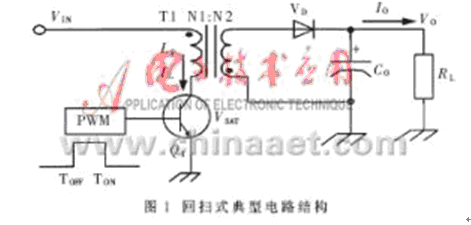 回掃式拓?fù)潆娐方Y(jié)構(gòu)無疑是目前比較理想的多路供電電源電路結(jié)構(gòu)。其峰值電感電流可檢測(cè)、輸出電壓擴(kuò)展性強(qiáng)等特點(diǎn),極大地提高了控制電路的穩(wěn)定性和抗干擾能力,便于供電電源的設(shè)計(jì)。