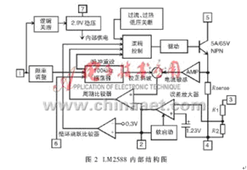 LM2588采用7腳TO-220封裝,主要包括100kHz振蕩器、2.9V穩(wěn)壓電路、誤差放大器、5A/65V的NPN開關(guān)管以及過流、過熱、低電壓鎖定,還包括軟啟動(dòng)、邏輯關(guān)斷、邏輯控制等,內(nèi)部結(jié)構(gòu)如圖2所示。